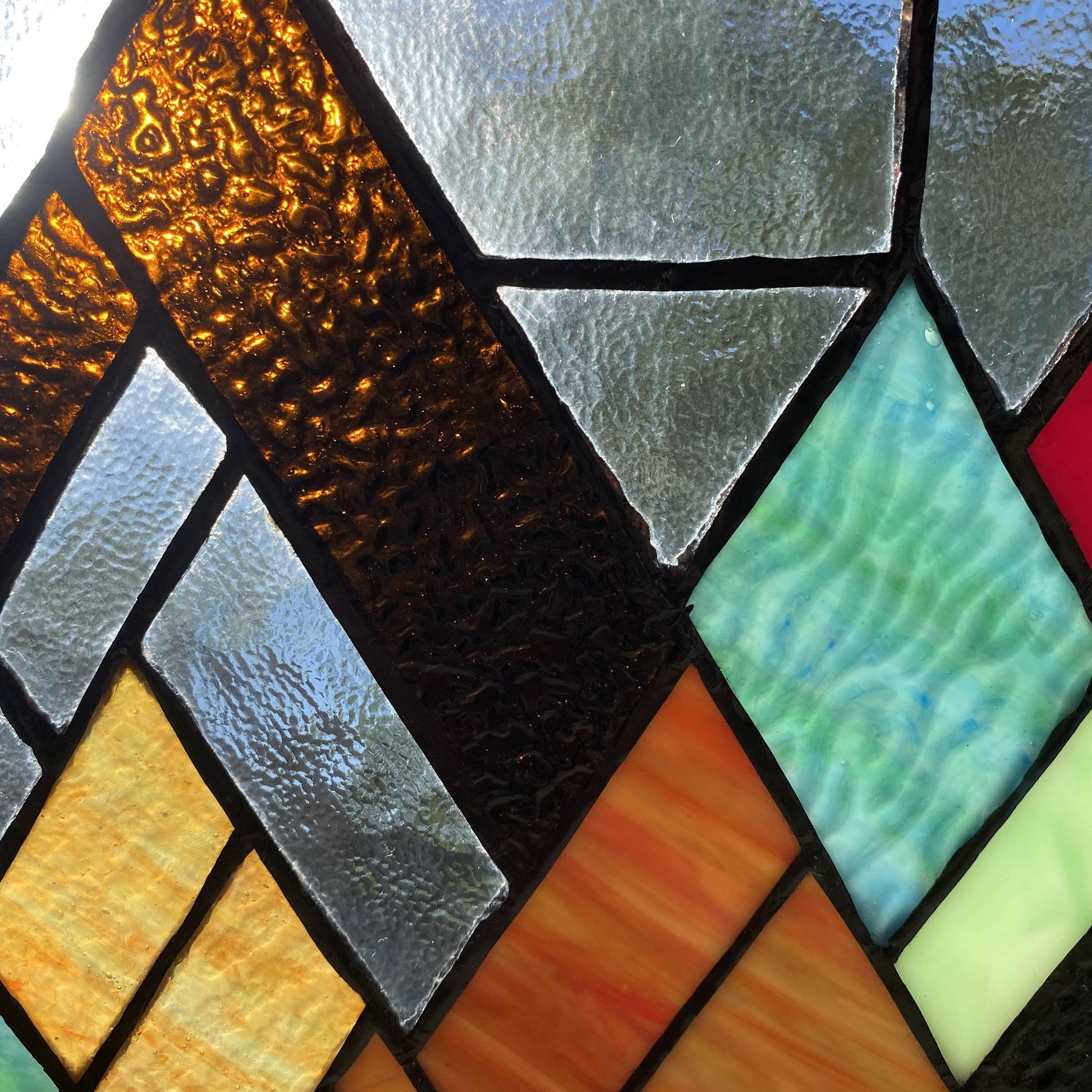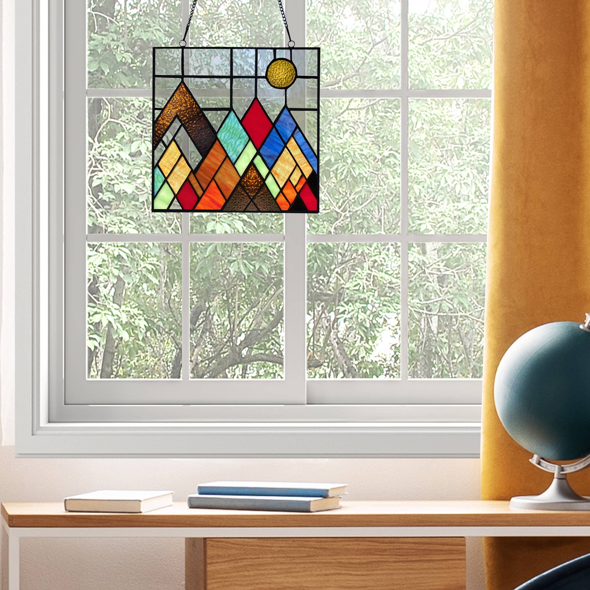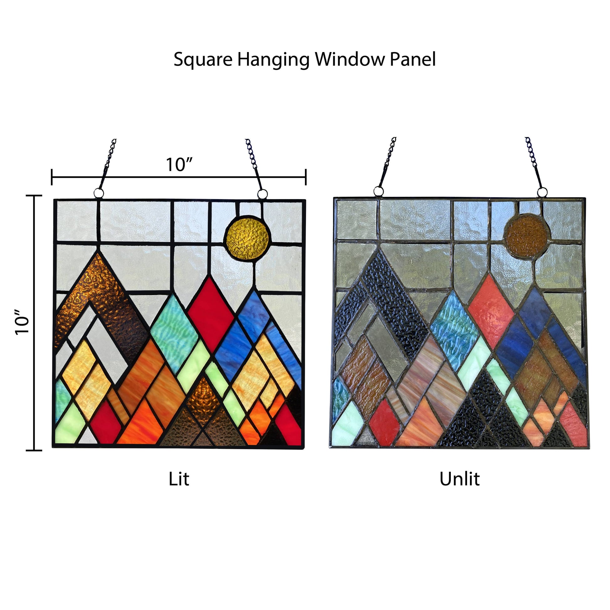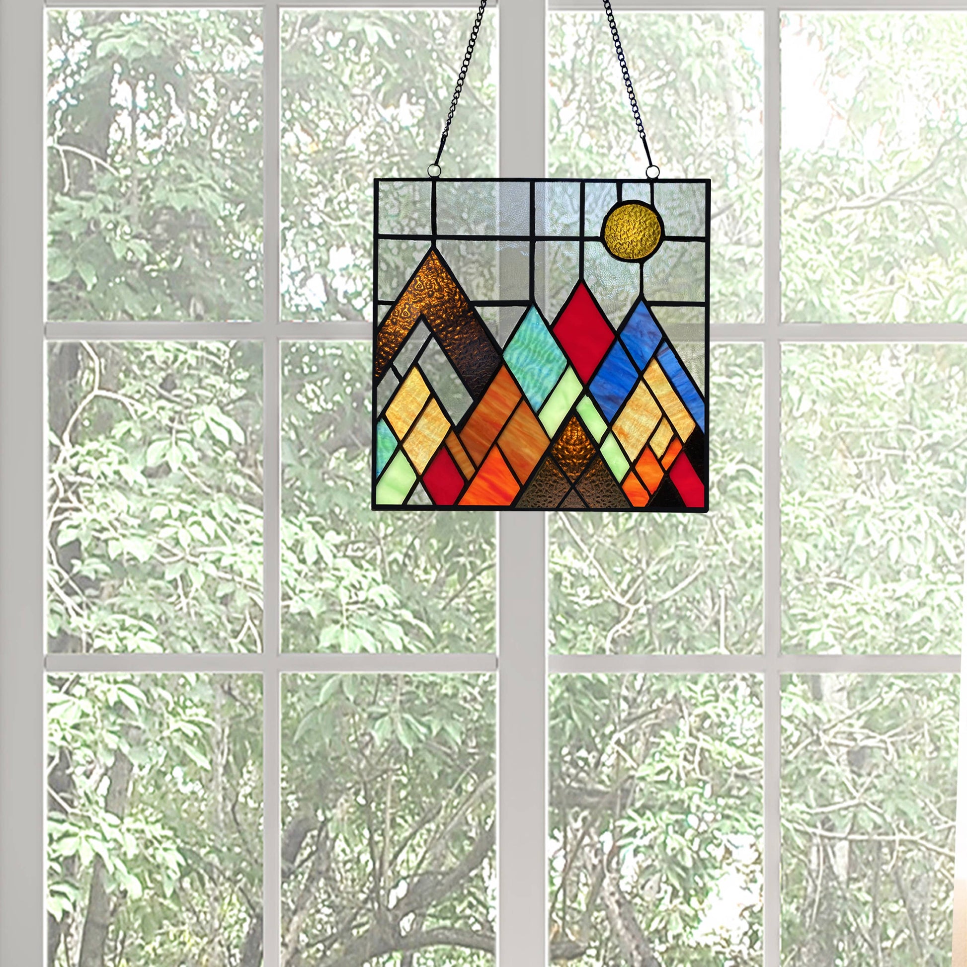 Mondrian-inspired Modernism is interpreted in different shades of amber, blue, brown and teal stained glass in this 10"H Beyond the Mountain Tops Multicolored Window Panel. Handcrafted from 51 glass cuts soldered with iron, this 10" square stained glass mountain range will dazzle in the sunlight from a bedroom, guest room or home office windows — just use the attached metal link chain for convenient hanging. Complete your Modernist, industrial, mid-century modern or minimalist décor with a contemporary take on the ancient art of stained glass with this stunning mountain scene stained glass suncatcher.