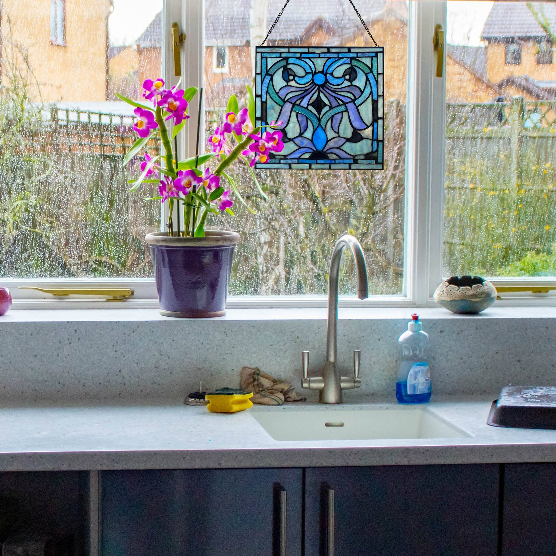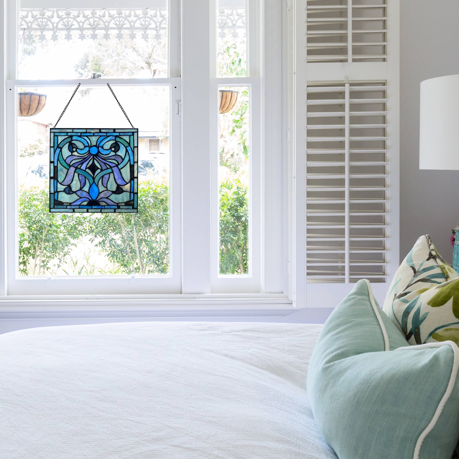 Hang this cottage-inspired stained glass window panel in any sunny window for a cheery, inviting decor accent. Handcrafted from 113 individual glass cuts, this stained glass suncatcher is created by-hand using the traditional copper foil soldering method for a unique look. It features a traditional-style geometric floral design in blue, purple and green hues that become more vibrant when light passes through the glass. Plus, the stained glass suncatcher comes with an attachable hanging chain for easy display in your living room, dining room or entryway.