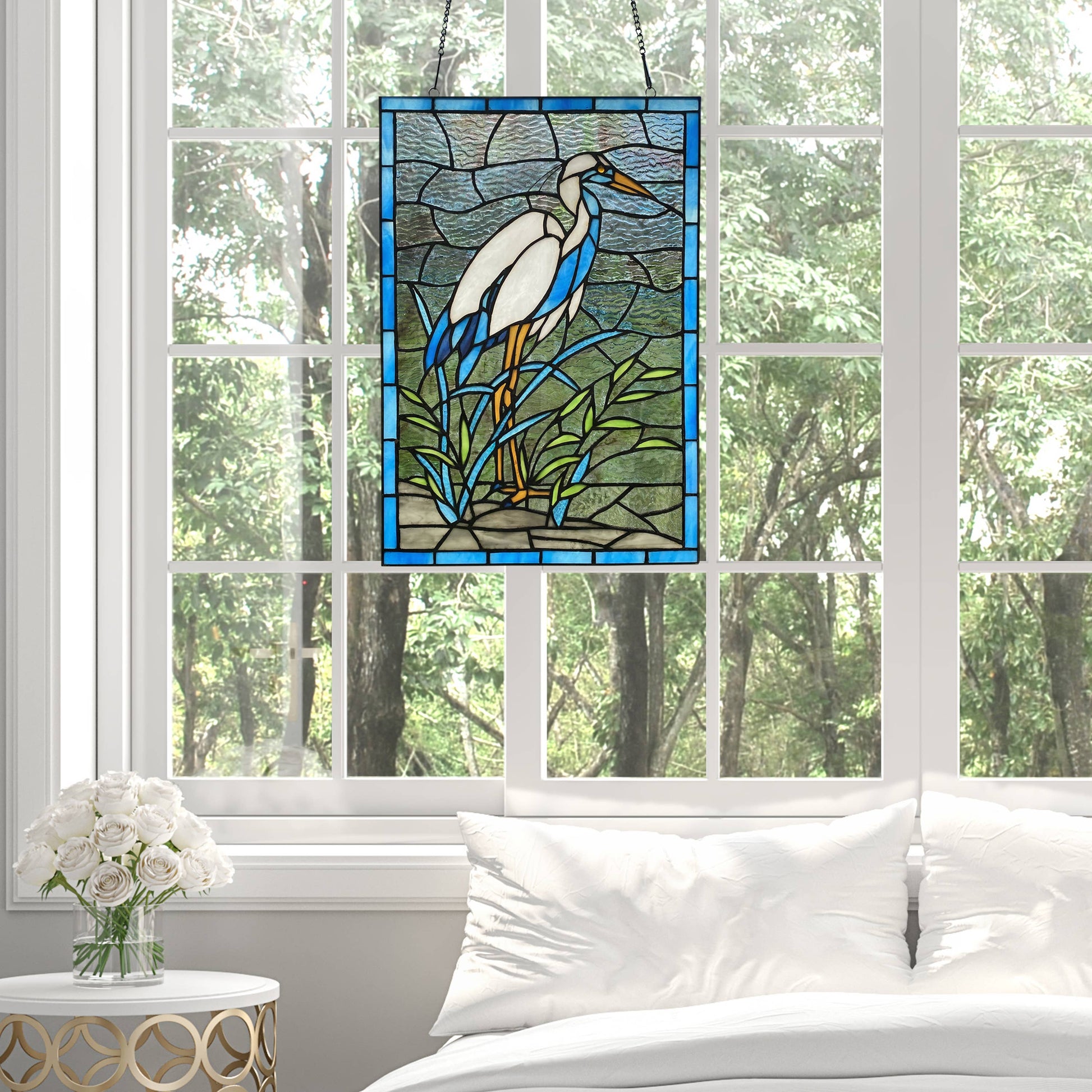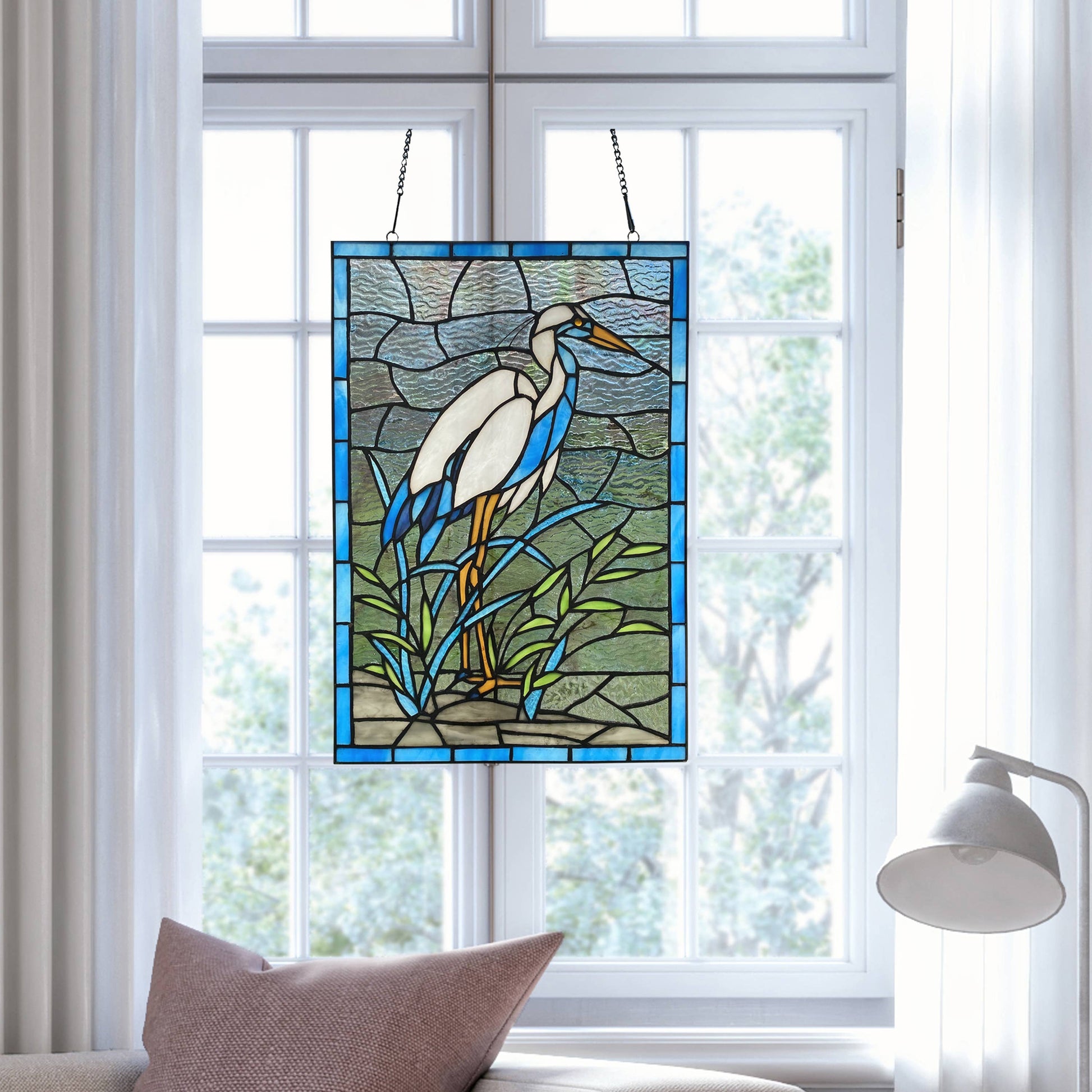 Featuring peaceful hues of Tiffany-style glass in blue, white and green, accented with hints of orange, this 18"H Majestic Crane Stained Glass Window Panel from River of Goods includes a single cabochon of orange Tiffany glass forming the crane's eye staring out into the middle distance from the shoreline. Handcrafted from 198 individual glass cuts, this 18"H stained glass suncatcher is created using artisanal iron soldering methods. A silver-colored metal link chain is attached for immediate hanging, whether in a sunny living room window or against an illuminated wall in a formal dining room for added drama. A true statement piece, this incredible stained glass artwork will be a family treasure for years to come.
