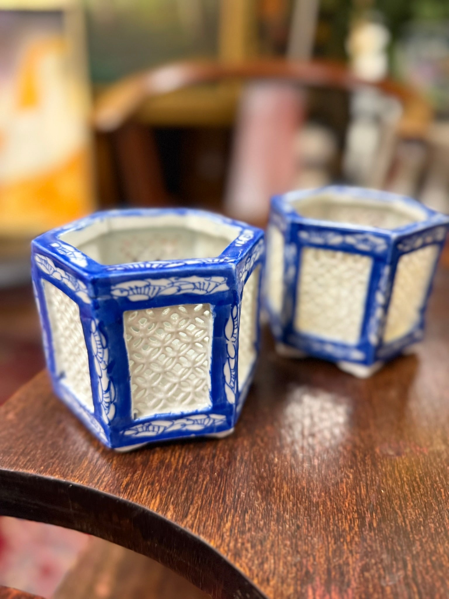 Antique 'cricket pots' from the late 1800s to early 1900s - they feature hexagonal porcelain blue and white reticulated Asian designs. Sold as a pair, these unique pieces are perfect for candles or as distinctive decorative accents.