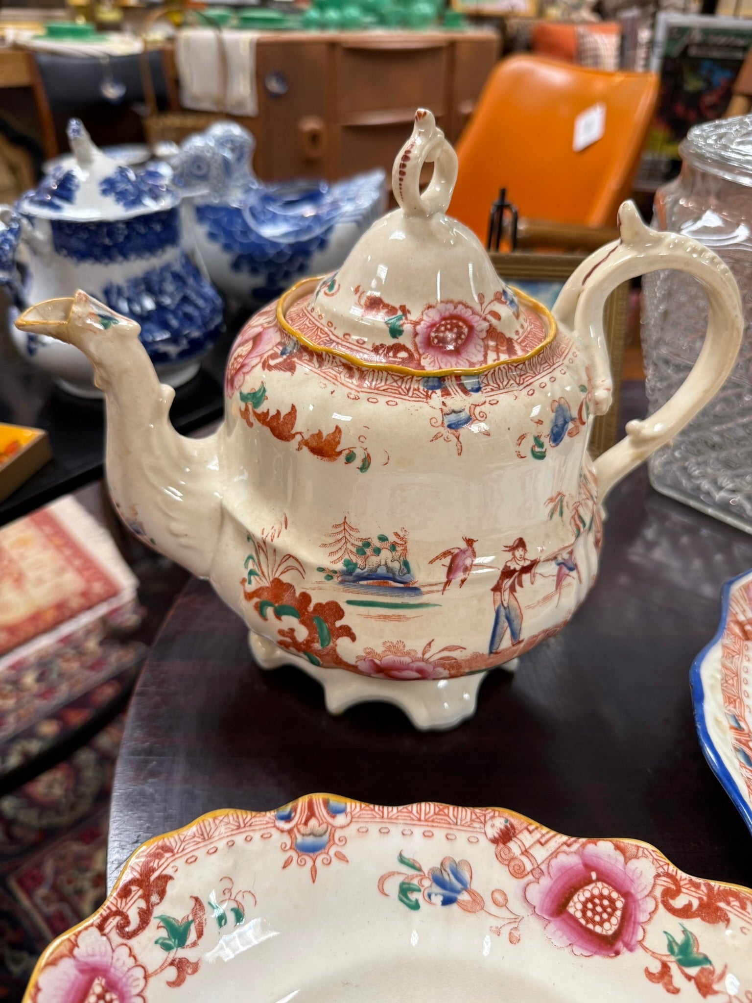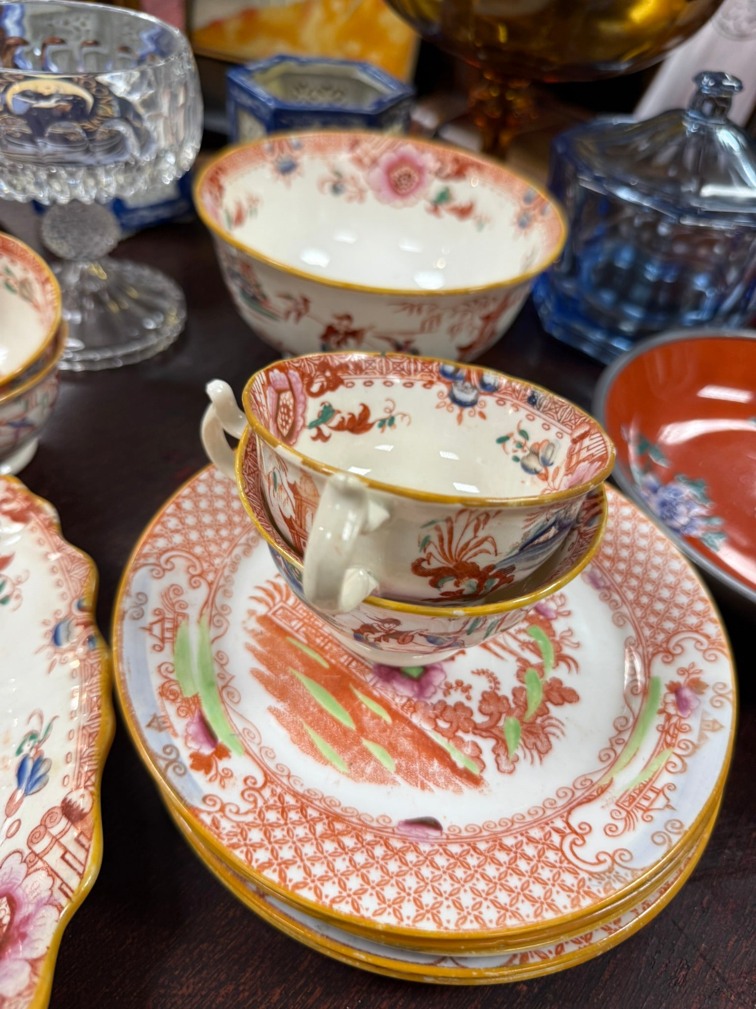 A rare and radiant example of early 19th-century British porcelain, this hand-painted Staffordshire chinoiserie set features warm rust-red transfers highlighted with delicate overglaze enamels in pink, green, blue, and yellow. Produced in the Hilditch style around 1830, these pieces showcase a whimsical Eastern-inspired landscape with pavilions, figures, and florals—each plate and serving piece a unique treasure of English ceramic artistry.
