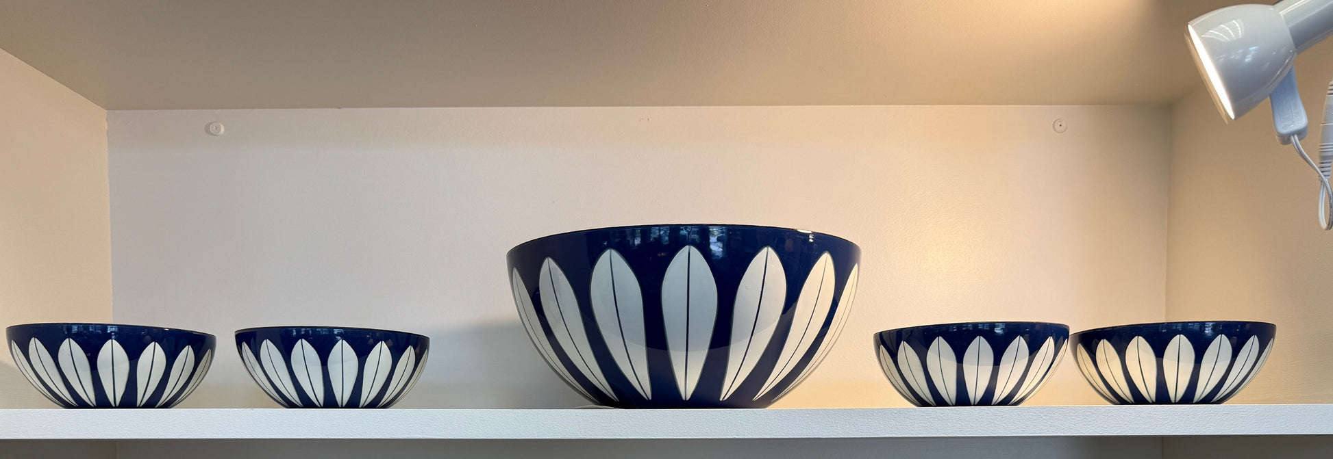 Cathrineholm Salad Set, from Norway, includes: Blue Lotus design, 11"d x 4 3/4"h salad bowl and four 5"d x 2 1/4"h small bowls.