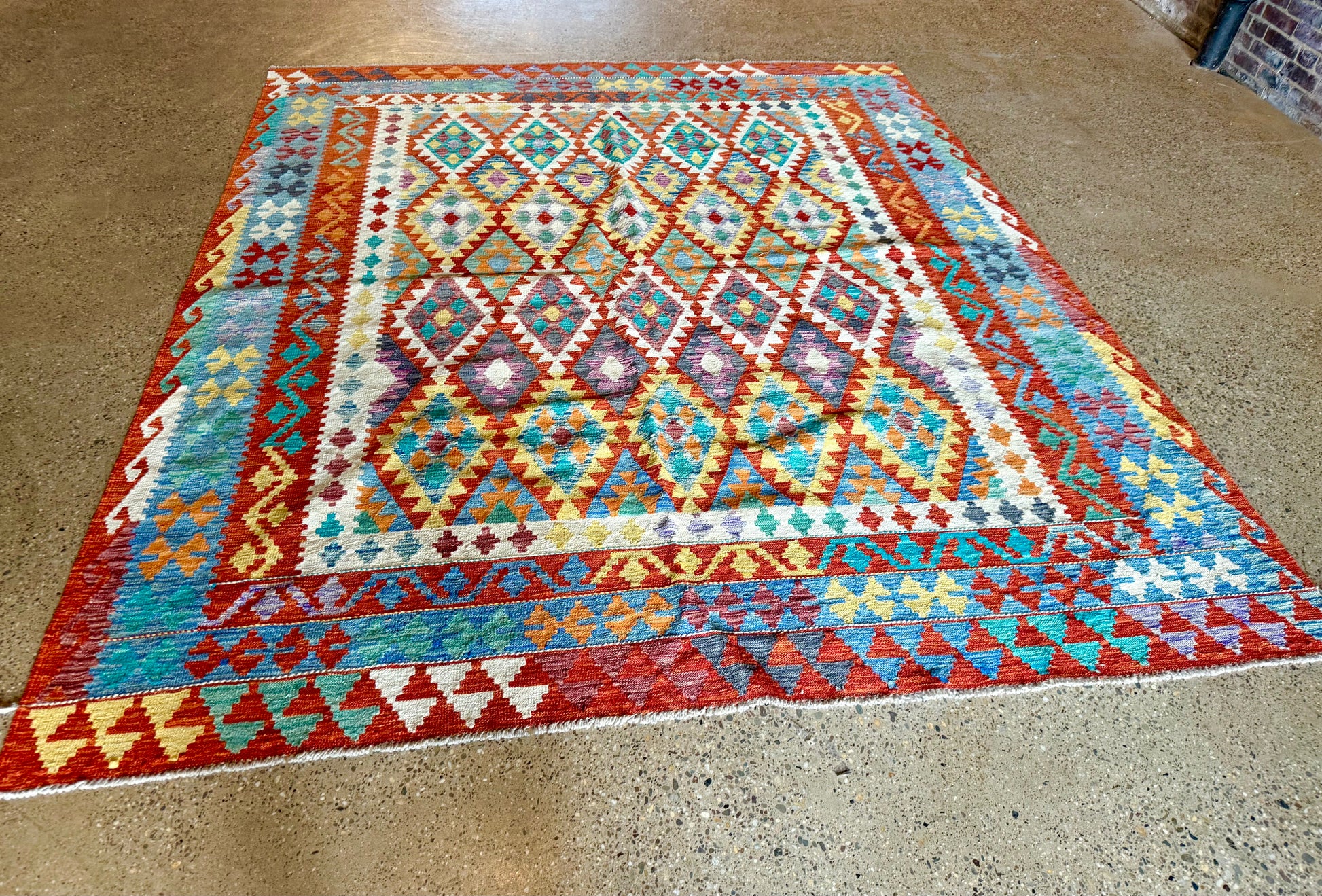 Bring color, character, and craftsmanship to your space with this stunning vintage Kilim rug. Measuring approximately 8.3 feet by 9.5 feet, this handwoven beauty is bursting with geometric patterns and vibrant hues—think terracotta, turquoise, goldenrod, deep plum, and more. A true statement piece, it’s the perfect anchor for a living room, bedroom, or creative studio.
