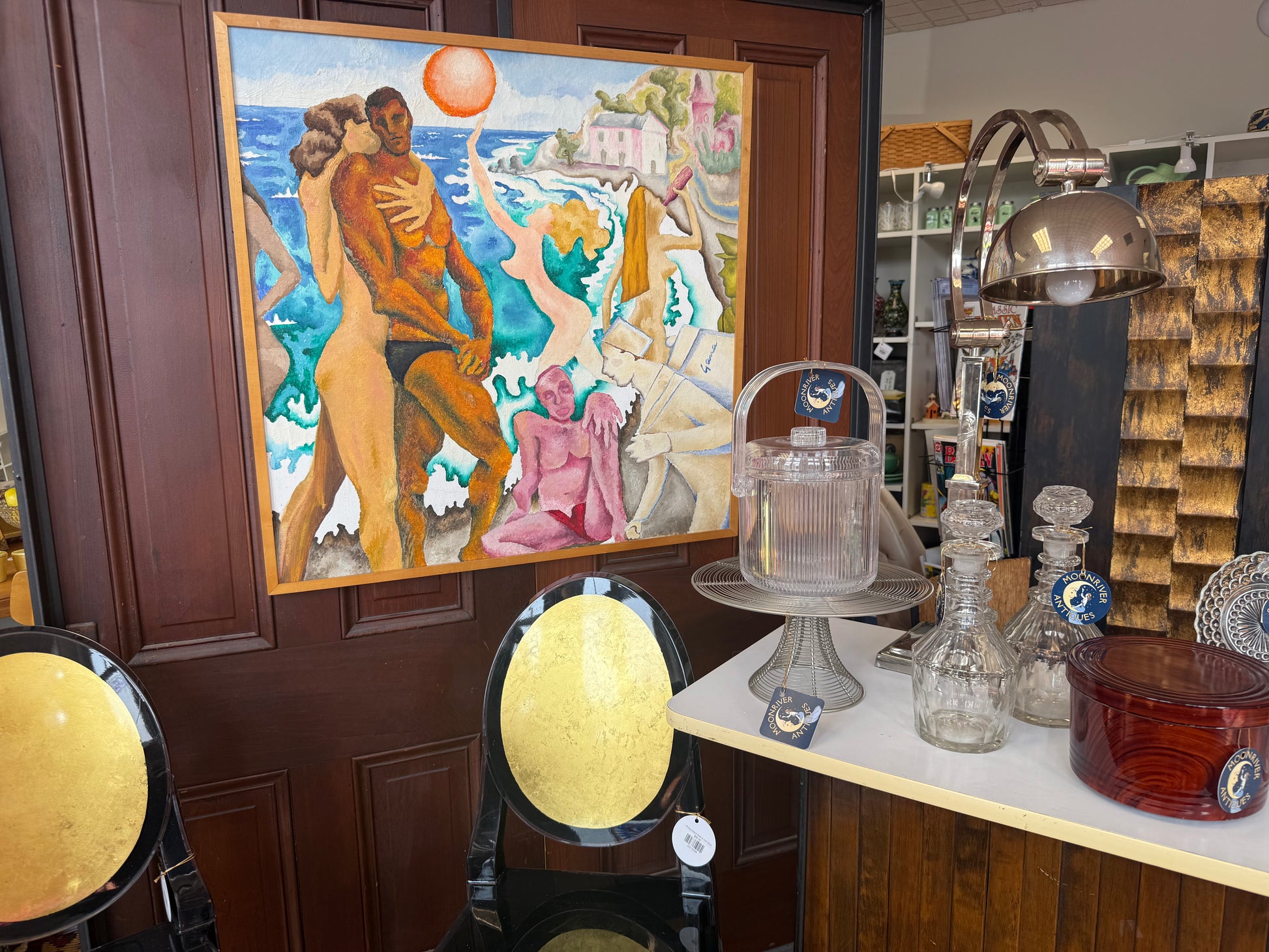 This 20th century Modernist oil painting captures the excitement and energy of a beach party, signed by artist 'Gana' and framed at 32.25 by 32.25 inches. The dynamic brushstrokes and vivid colors bring life to any space, making it a captivating addition to your art collection.