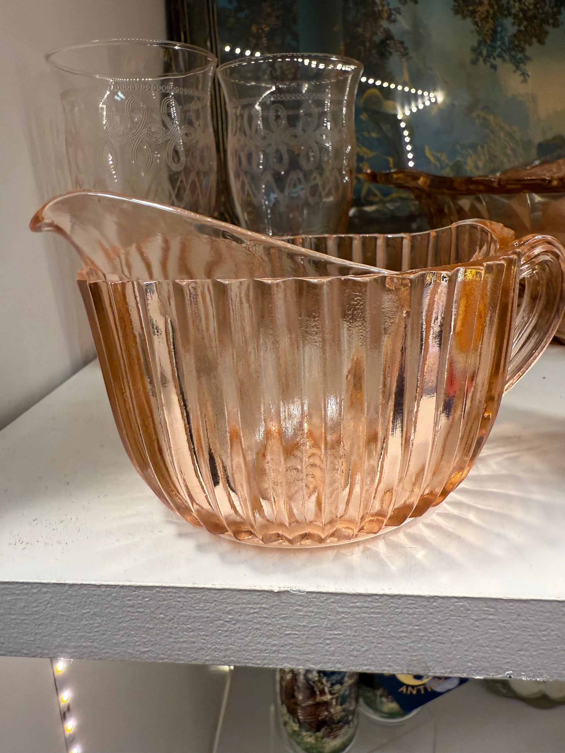 This rare vintage pink creamer dish features a charming star-shaped base, measuring 4" by 3". Its playful design adds a unique touch to any collection or table setting. Perfect for those who appreciate distinctive, collectible glassware.