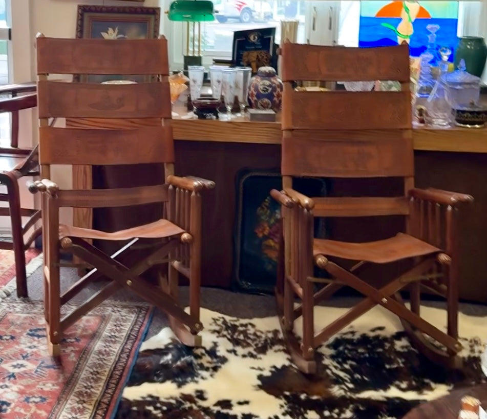 Sold as a pair, these tooled leather wood frame rocking chairs feature intricate Costa Rican scenes embossed into the leather for a unique, handcrafted look. Their sturdy wood frames fold easily with X-frame bases for convenient storage. Measuring 45" high with 26" wide arms and an 18" seat, they provide comfortable and stylish seating. Perfect for adding character and charm to any room, these well-constructed rockers are in good condition and ready to be enjoyed.