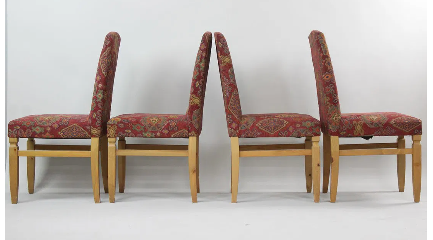 We have 4 of these chairs overall, selling in sets of 2. These contemporary chairs showcase soft fabric upholstery with a subtle Kilim-inspired pattern, crafted in Italy. Each chair measures 38" high, 18" wide, and 20" deep, combining elegant design with comfortable seating.These chairs bring a warm touch to any space.