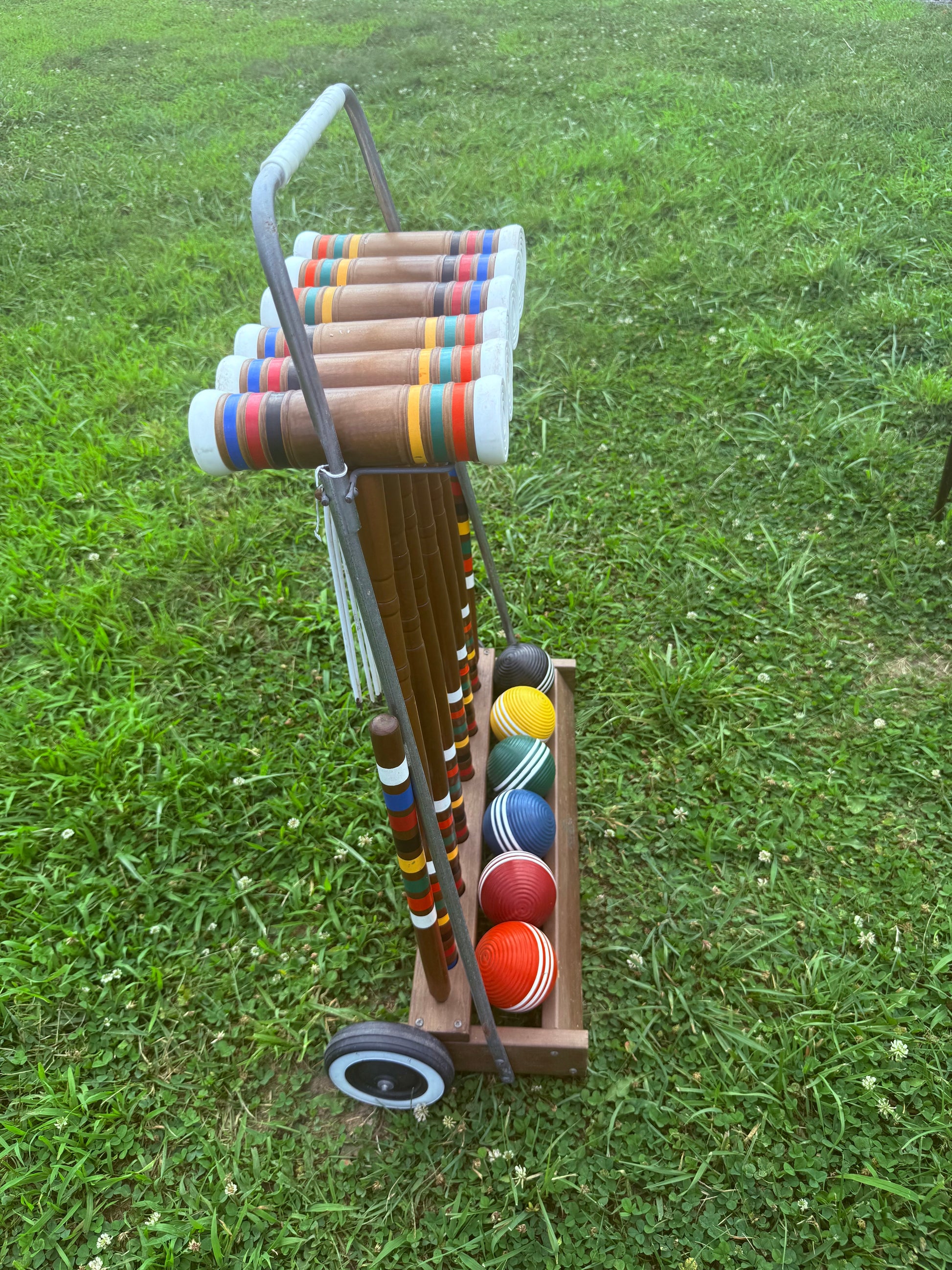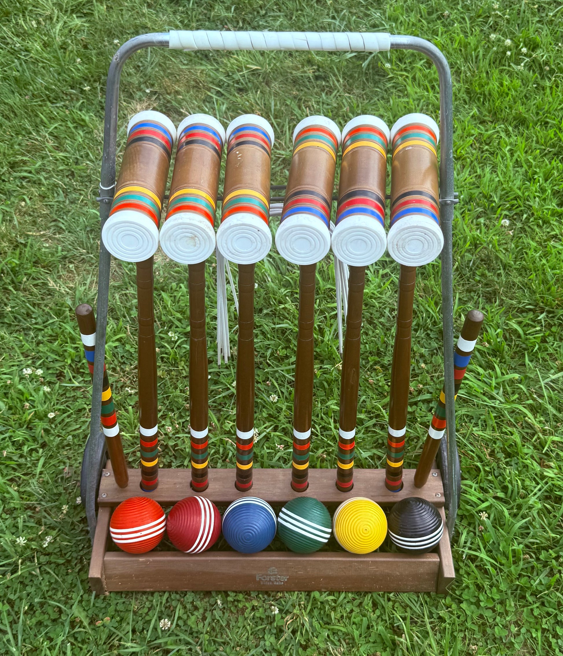 Bring back the golden age of lawn games with this vibrant vintage Forester croquet set. Includes six wood-handled mallets with painted color bands, six coordinating croquet balls, two end stakes, and the original wood & metal wheeled caddy for easy transport and display.