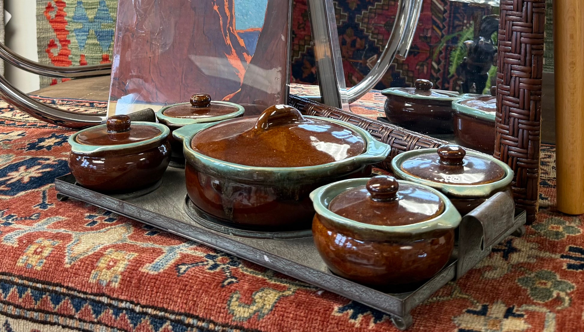 Vintage Zanesville Pottery Country Fare baking dish set (1940s-1960s), designed by John B. Taylor. Features the signature brown & turquoise glaze. Rarely found with the original tray and with all the dishes with their lids in excellent condition. There are 4 covered bowls and one cassorole dish with the original serving tray. The tray has indendentations to set the dishes on. Beautiful set! Excellent condition with no chips or cracks
